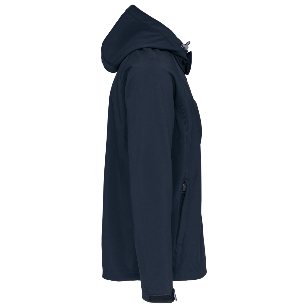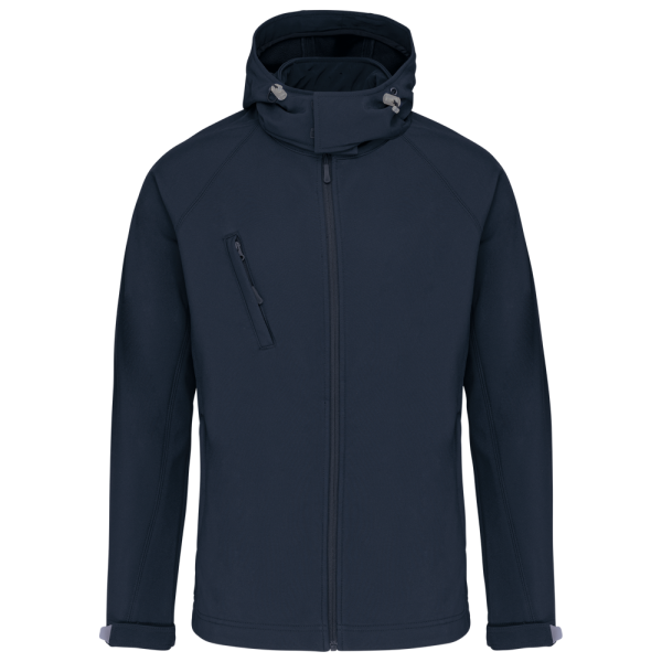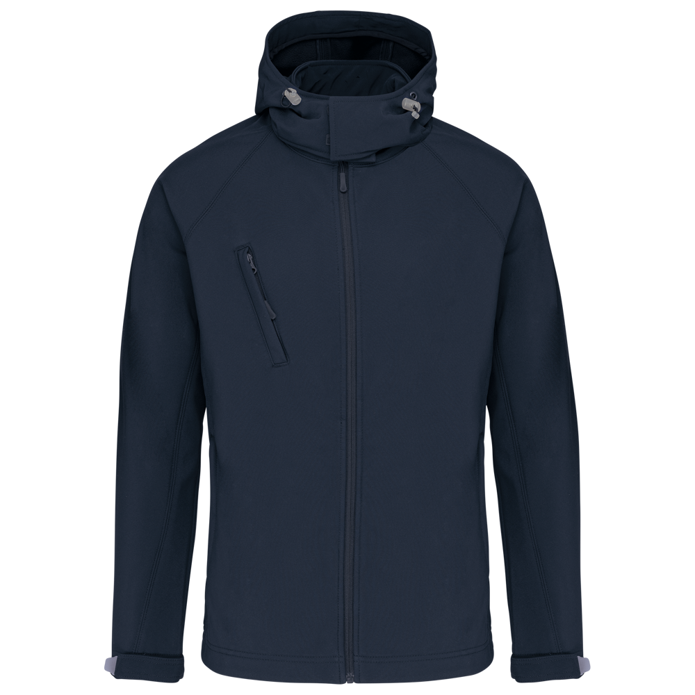 Stof in 3 lagen op elkaar geklit. Ademend 1000 g/m²/24h en 5000 mm waterdicht. Buitenkant: 95% polyester en 5% elasthan. Tussenlaag: ademend ventilerend membraan. Binnenkant: anti-pluis polyester. Raglan mouwen. Ritssluiting. 2 voorzakken met rits. 1 borstzak rechts met rits. Afneembare capuchon met aanrijgkoord en klittenbandsluiting. Klittenbandsluiting aan de mouwuiteinden. Verborgen drukkersrits op borsthoogte. Raglan mouwen.