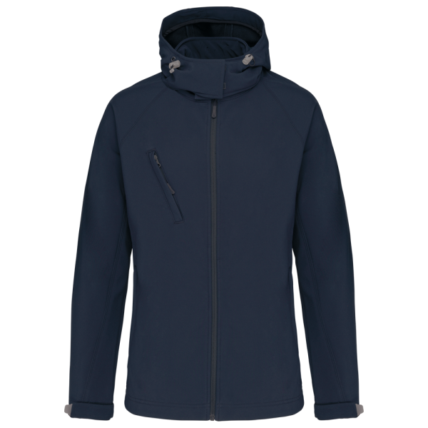 Stof in 3 lagen op elkaar geklit. Ademend 1000 g/m²/24h en 5000 mm waterdicht. Buitenkant : 95% polyester en 5% elasthan. Tussenlaag: ademend ventilerend membraan. Binnenkant: anti-pluis polyester. Raglan mouwen. Ritssluiting. 2 voorzakken met rits. 1 borstzak rechts met rits. Afneembare capuchon met aanrijgkoord en klittenbandsluiting. Klittenbandsluiting aan de mouwuiteinden. Verborgen drukkersrits op borsthoogte.
