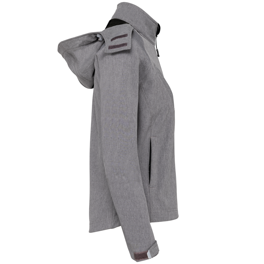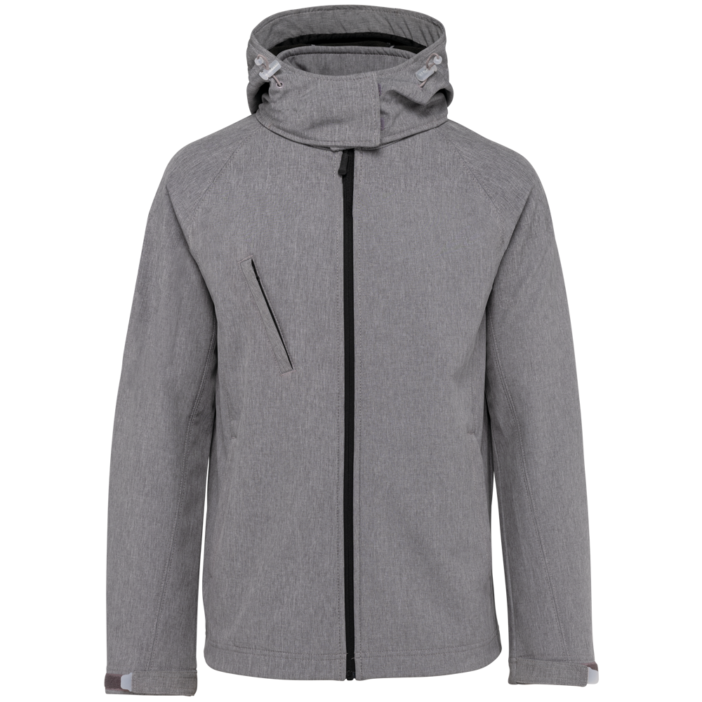 Stof in 3 lagen op elkaar geklit. Ademend 1000 g/m²/24h en 5000 mm waterdicht. Buitenkant : 95% polyester en 5% elasthan. Tussenlaag: ademend ventilerend membraan. Binnenkant: anti-pluis polyester. Raglan mouwen. Ritssluiting. 2 voorzakken met rits. 1 borstzak rechts met rits. Afneembare capuchon met aanrijgkoord en klittenbandsluiting. Klittenbandsluiting aan de mouwuiteinden. Verborgen drukkersrits op borsthoogte.