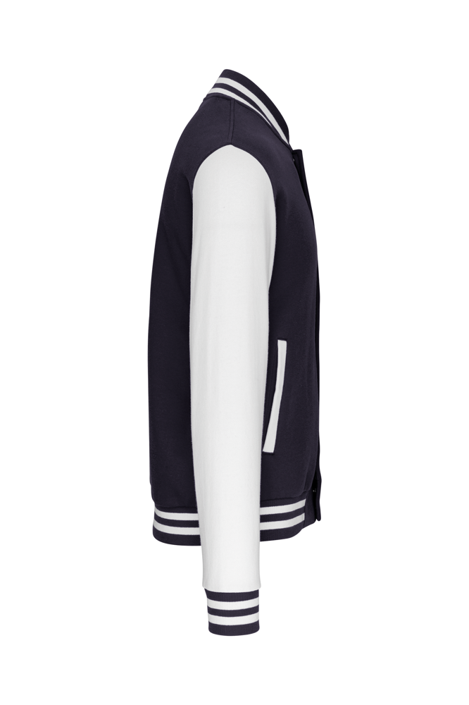 70% katoen / 30% polyester. Geborsteld fleece 3 draden. Contrasterende ingezette mouwen. Sluiting aan de voorkant met contrasterende drukknopen. Ribboord met 2 contrasterende biesjes aan kraag, mouwen en onderkant. 2 contrasterende omzoomde zakken aan de voorkant. Nektape met visgraatmotief en ophanglus in de kraag. Geen merklabel in de kraag, maar enkel een maatlabel voor eenvoudige personalisatie. De legendarische college jacket gaat al vele jaren mee. Hij is alomtegenwoordig: van de straat tot de schoolbanken