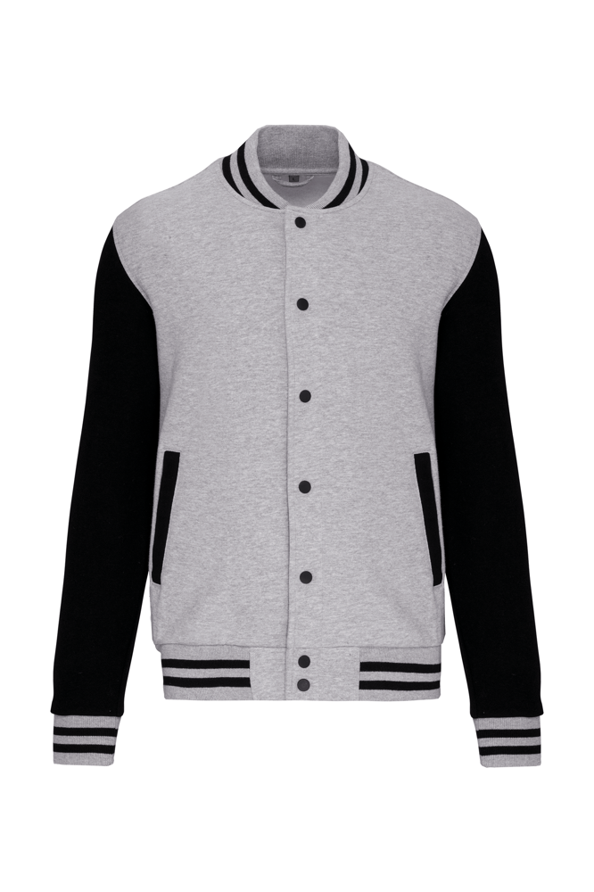 70% katoen / 30% polyester. Geborsteld fleece 3 draden. Contrasterende ingezette mouwen. Sluiting aan de voorkant met contrasterende drukknopen. Ribboord met 2 contrasterende biesjes aan kraag, mouwen en onderkant. 2 contrasterende omzoomde zakken aan de voorkant. Nektape met visgraatmotief en ophanglus in de kraag. Geen merklabel in de kraag, maar enkel een maatlabel voor eenvoudige personalisatie. De legendarische college jacket gaat al vele jaren mee. Hij is alomtegenwoordig: van de straat tot de schoolbanken