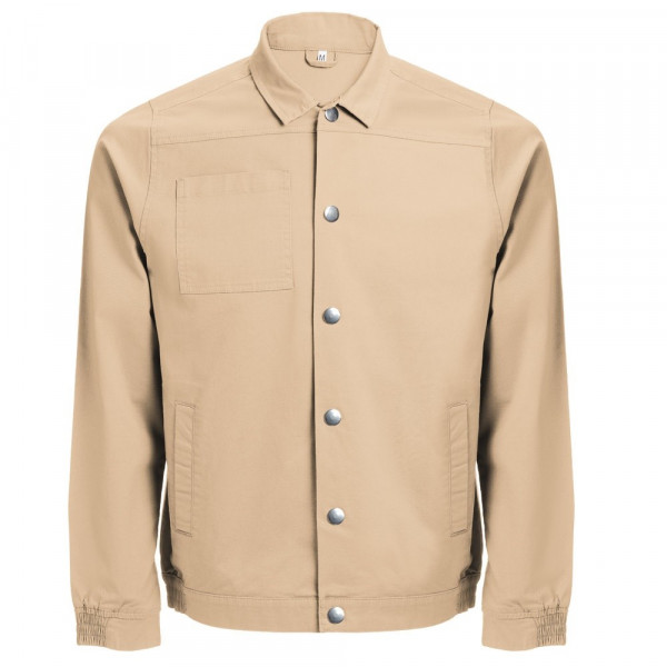 Jas van 98% katoen en 2% elastaan (240 g/m²). Modern model met 2 figuurnaden op de rug en elastiek op de pols en in de taille. Knoopsluiting door middel van drukknopen. Met 2 achterzakken en 1 borstzak. Maten: S, M, L, XL, XXL, 3XL