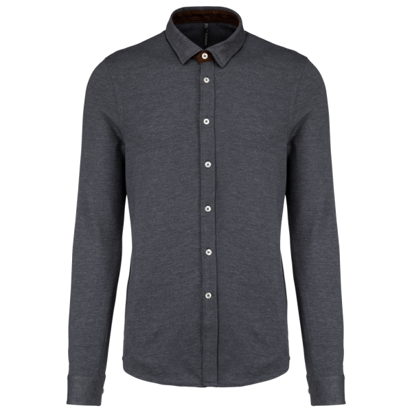 68% katoen / 32% polyester. Jacquardtricot. Kraagstaander van contrasterend suèdine. Moderne look. Comfortabele en zachte stof. Klassieke knooplijst met knoop in imitatieparelmoer. Regelbare manchetten met knopen in imitatieparelmoer. Afgeronde boord aan de onderkant.