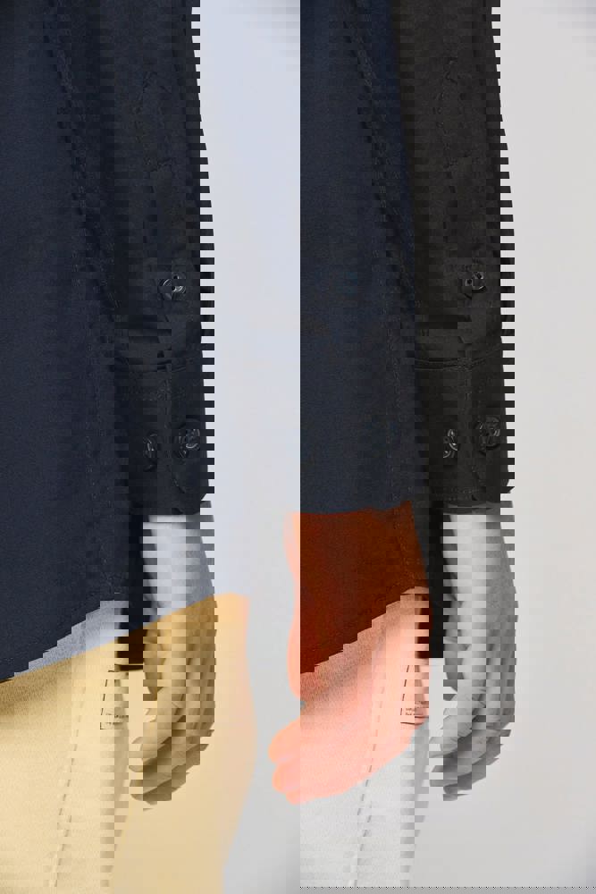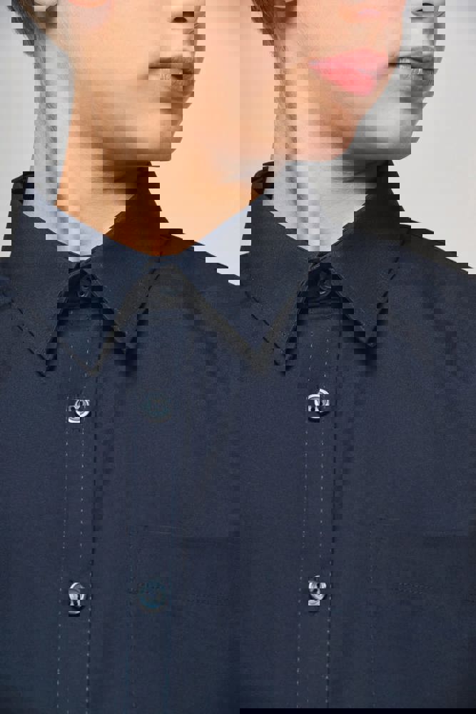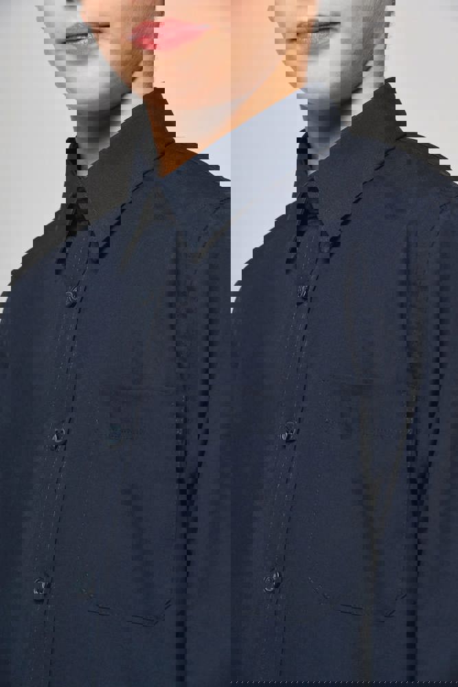 100% katoen. Gemakkelijk in onderhoud ( Easy Care). Verstevigde kraag met baleinen. Toon op toon knopen. Borstzakje. Dubbel inzetstuk op de rug. Afgewerkt met vouwnaden. Mouwuiteinden met knopen. 2 extra knopen. Afgerond boord aan de onderkant.