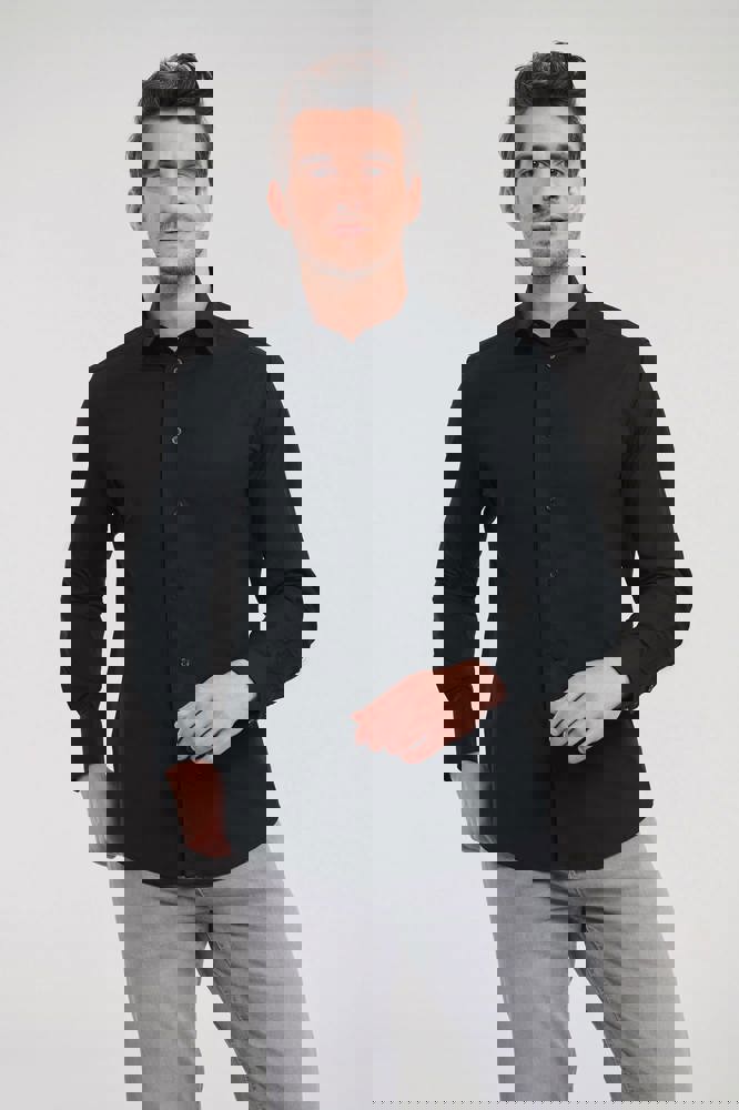 97% katoen / 3% elasthan poplin. Fitted model. Gladde stof met stretch zorgt voor comfort en mooie pasvorm. Open kraag met 1 knoopje. Rechte mouwuiteinden met 2 knopen en een knoop op de mouw. Afgeronde onderkant. Reserveknoopjes. EasyCare.