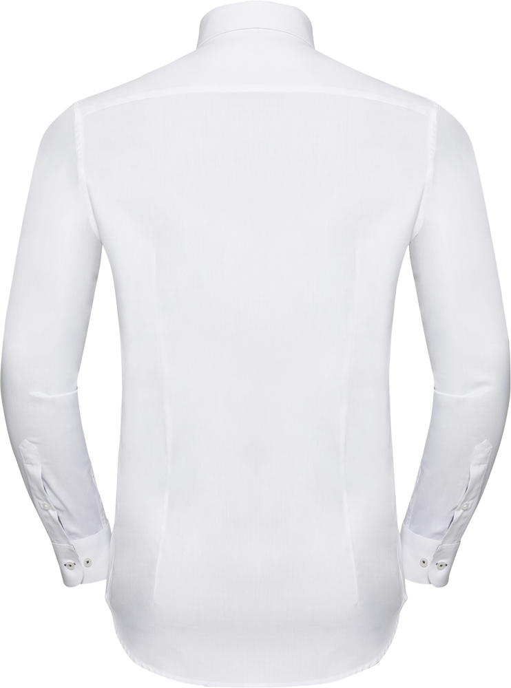 84% katoen / 16% polyester. Getailleerd. Kraagstaander met knopen. Contrasterende elementen: binnenkant manchetten, binnenkant kraag met contrasterende bies. Lage knooplijst met contrasterende boorden. Contrasterende kleuren aan de knoopsgaten van de manchetten en het onderste knoopsgat. Plooien op de achterkant voor een betere pasvorm. Regelbare, afgeronde manchetten met twee knopen. Afgeronde zoom.