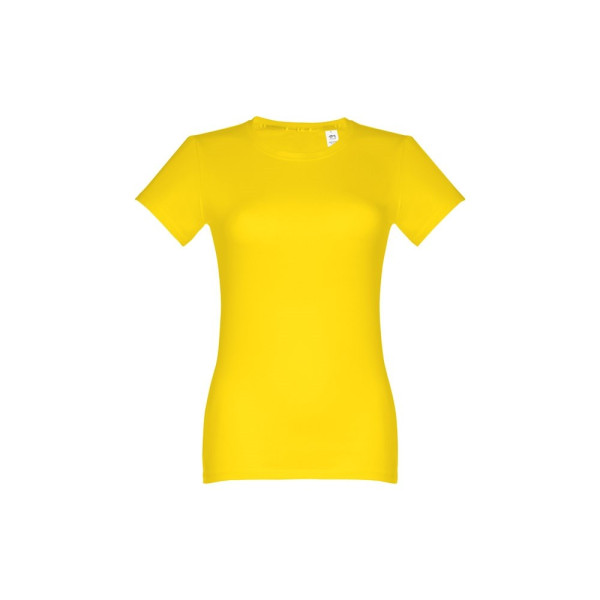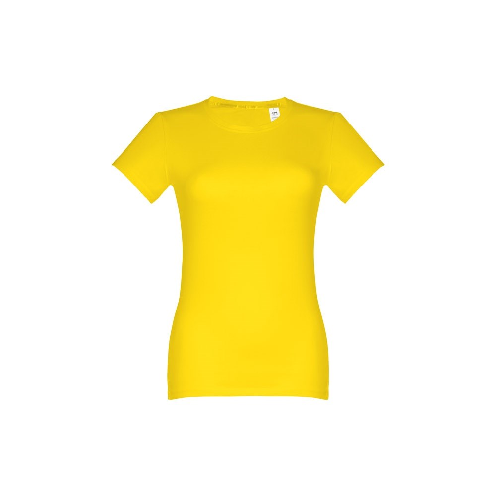Getailleerd 100% gekaard katoenen jersey dames T-shirt (190 g/m²) (kleur 183: 90% katoen en 10% viscose). Bevat dunne jersey kraag met satijnen verstevigingslint. Gesneden en genaaid stuk met dubbele zoom aan de mouwen en onderkant. Maten: S, M, L, XL, XXL