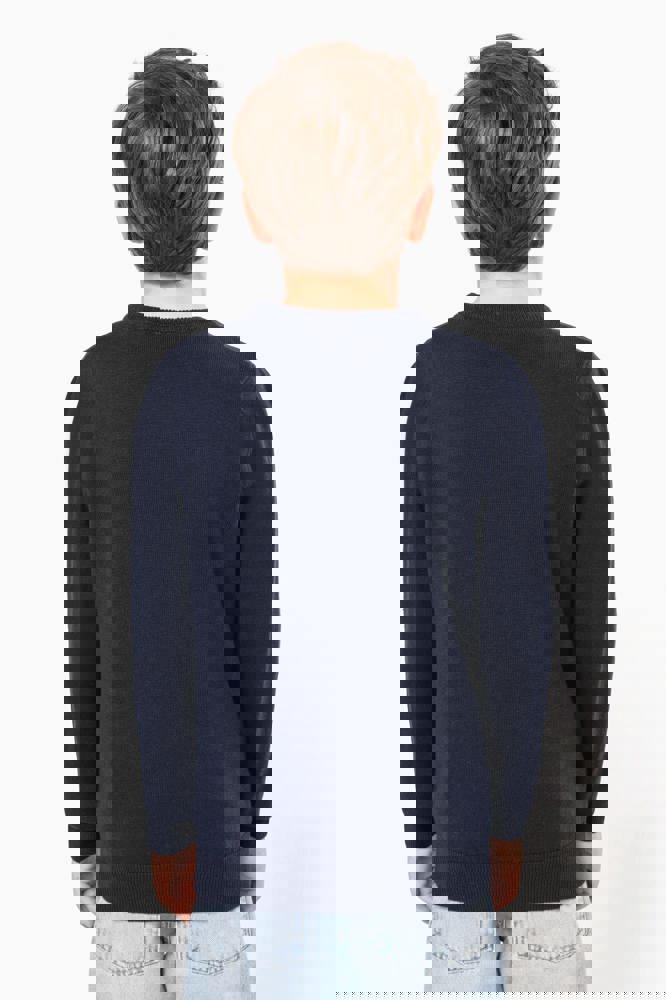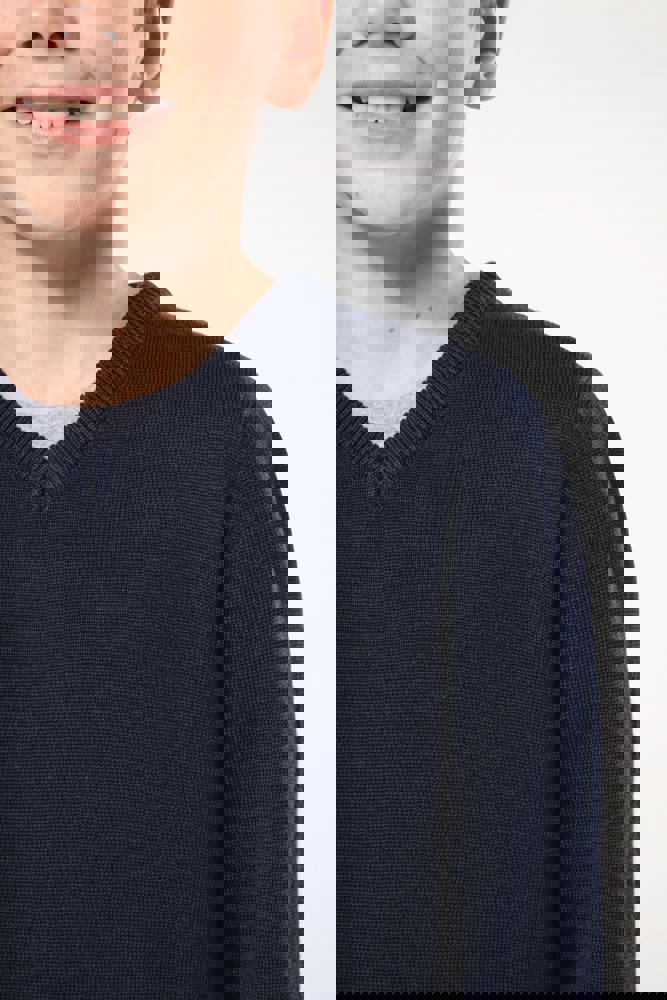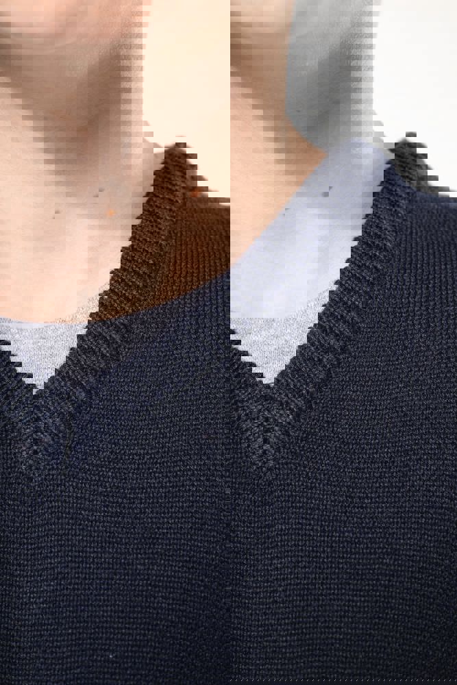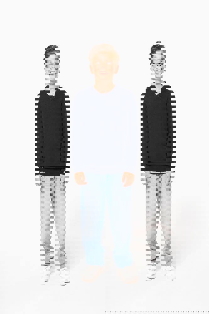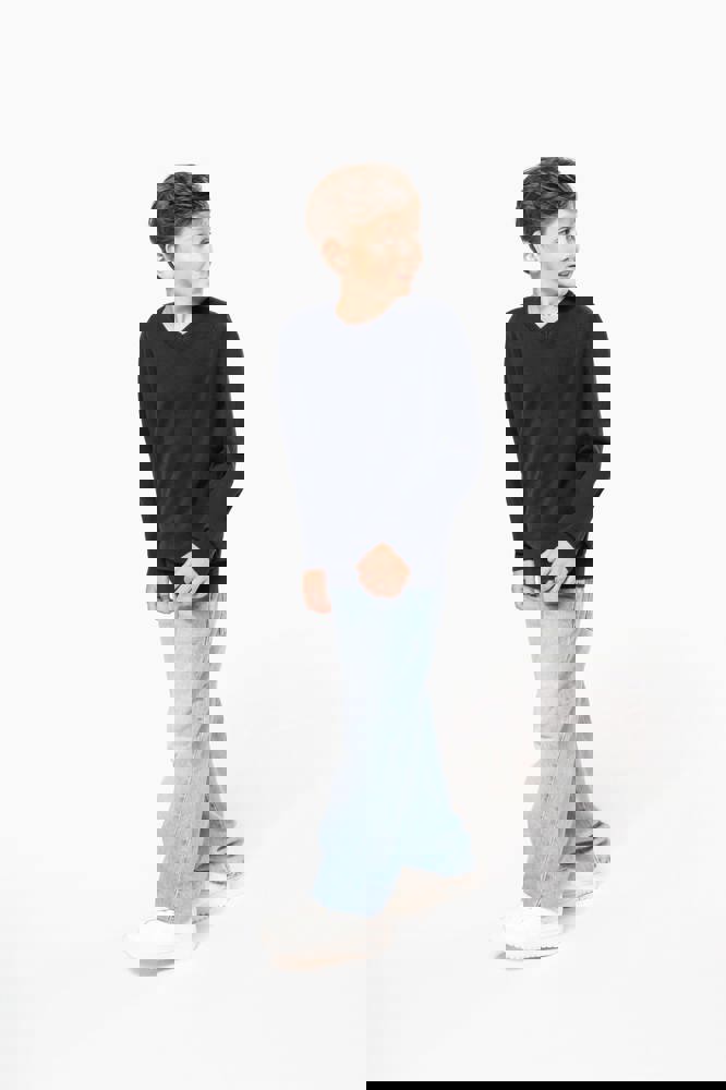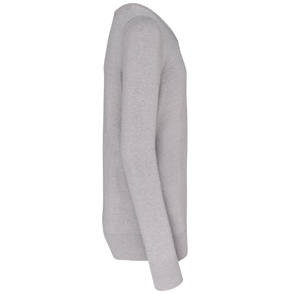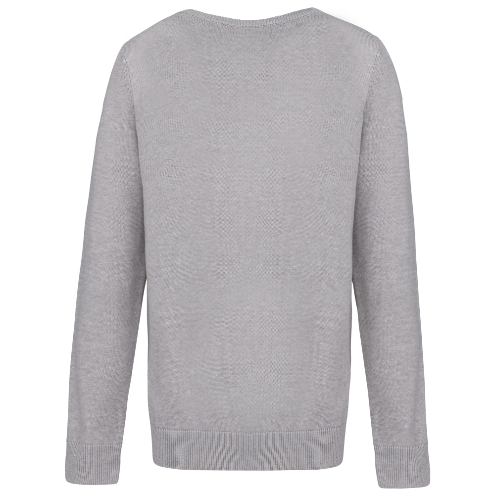 50% katoen / 50% acryl. Acryl gauge 12. Ribboord met dubbele dikte aan de kraag. Nektape. Ribboord aan mouwuiteinden en onderkant.