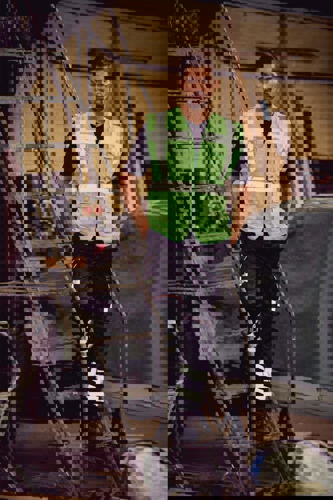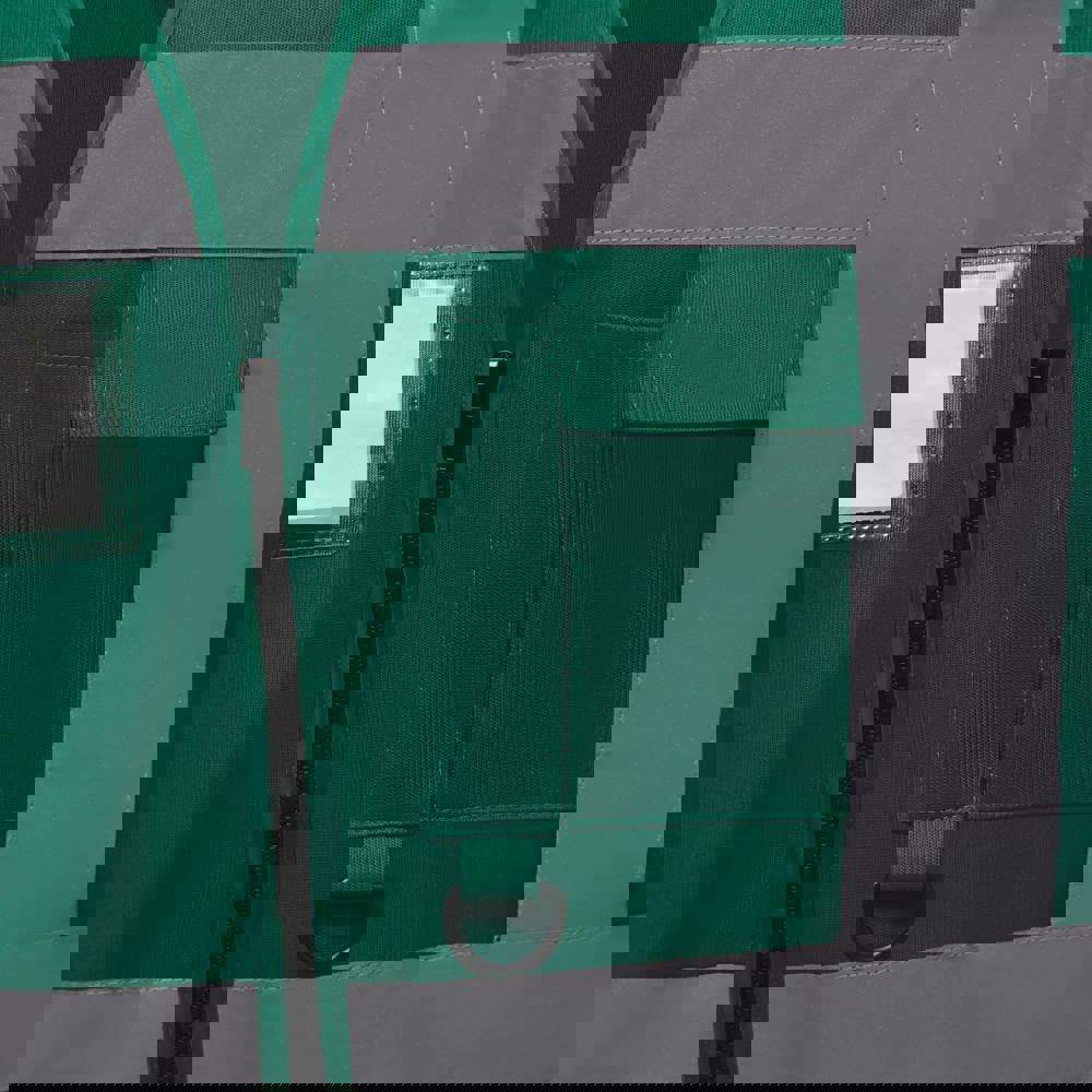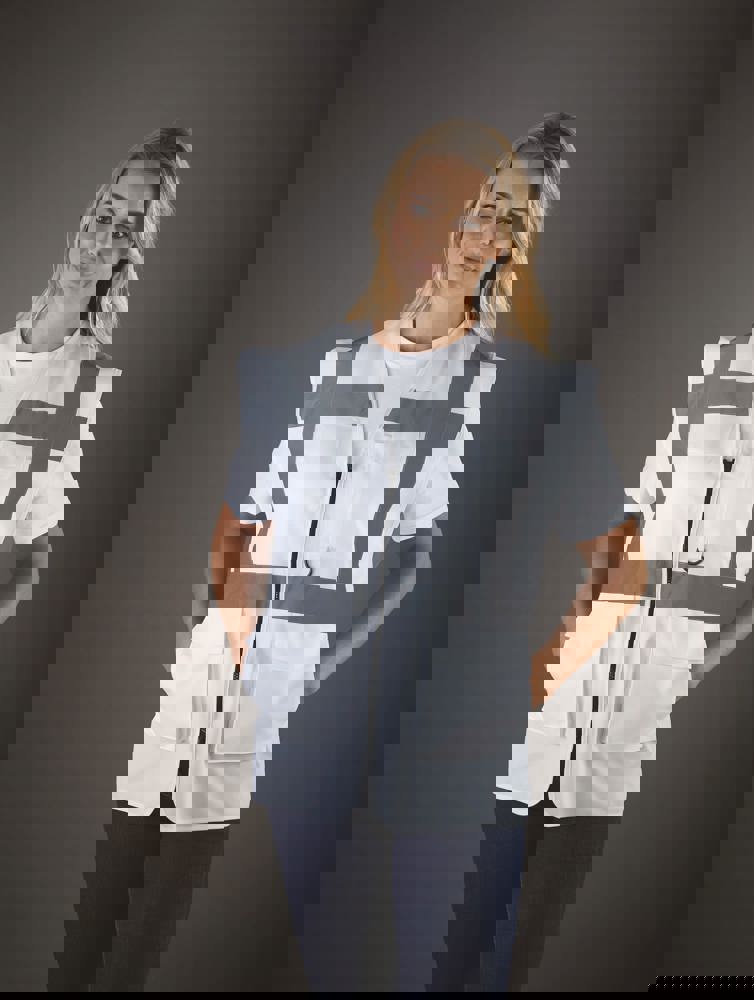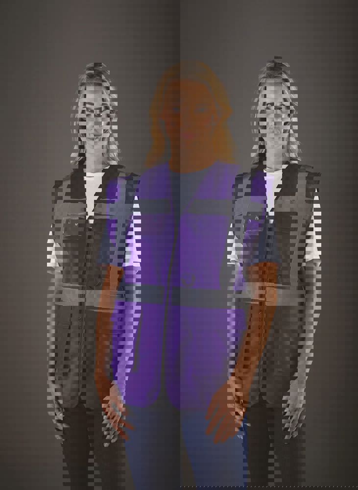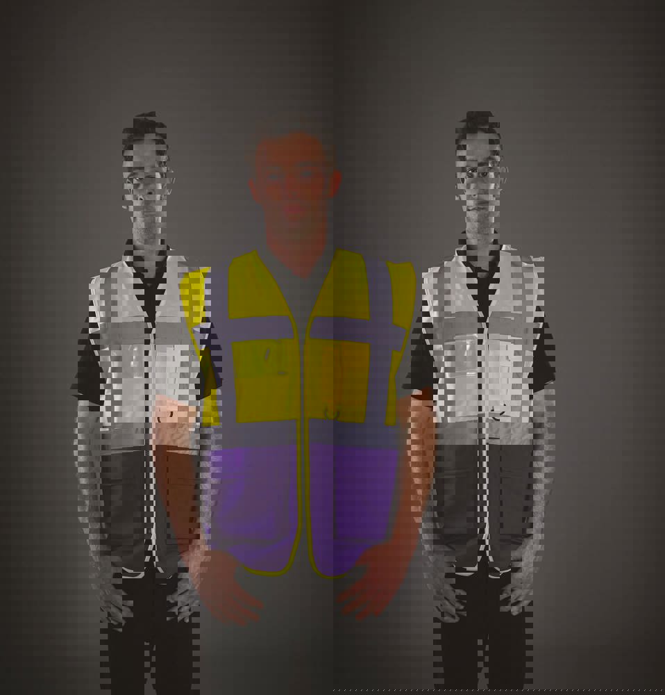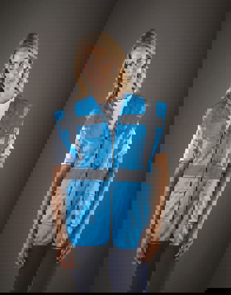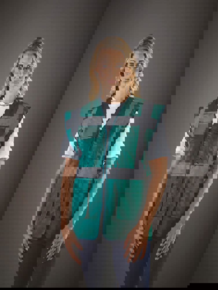 100% polyester. 5 cm brede reflectiebanden rond het lichaam en één over elke schouder. Mobiele telefoon/walkie-talkie zak op de borst links vooraan. Ritssluiting vooraan over de hele lengte. Twee zakken onderaan met flappen en toegankelijk van de boven- en zijkant. Penzakken en sleutelhouder. ID-zak op de rechterborst. Groot oppervlak op achterkant voor decoratie. Voldoet aan de volgende normering: -EN ISO20471:2013 Klasse 2: enkel Hi Vis Yellow, Hi Vis Orange en Hi Vis Yellow/Hi Vis Orange. -EN ISO20471:2013 Klasse 1: enkel Paramedic Green/Hi Vis Yellow, Royal Blue/Hi Vis Yellow, Red/Hi Vis Yellow, Hi Vis Yellow/Black, Hi Vis Orange/Black, Hi Vis Yellow/Navy, Hi Vis Orange/Navy, Hi Vis Yellow/Grey, Hi Vis Orange/Grey en Hi Vis Yellow/Purple.