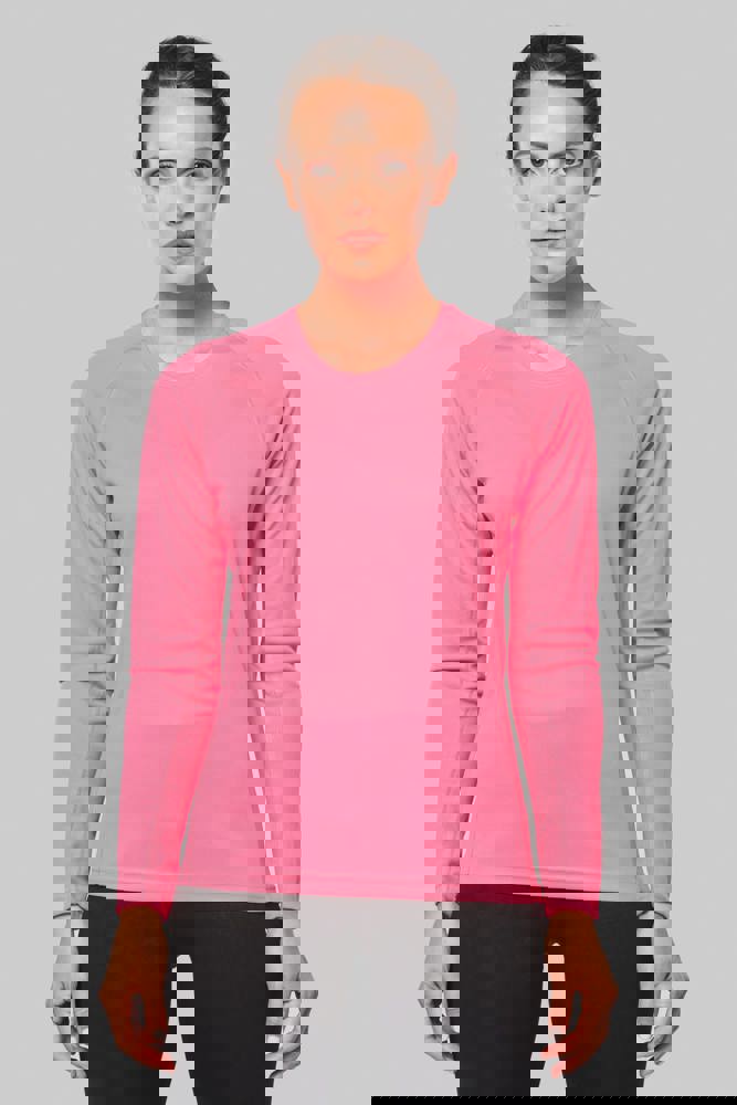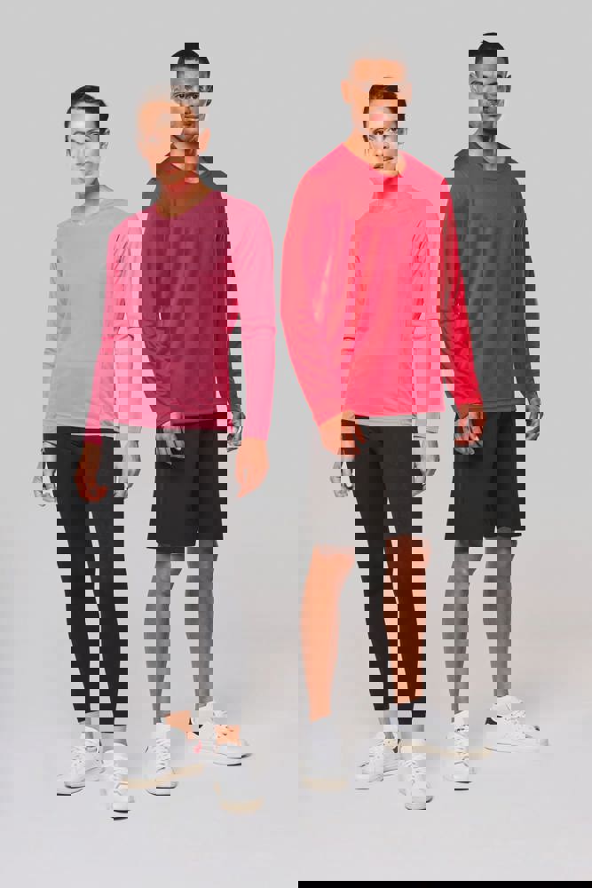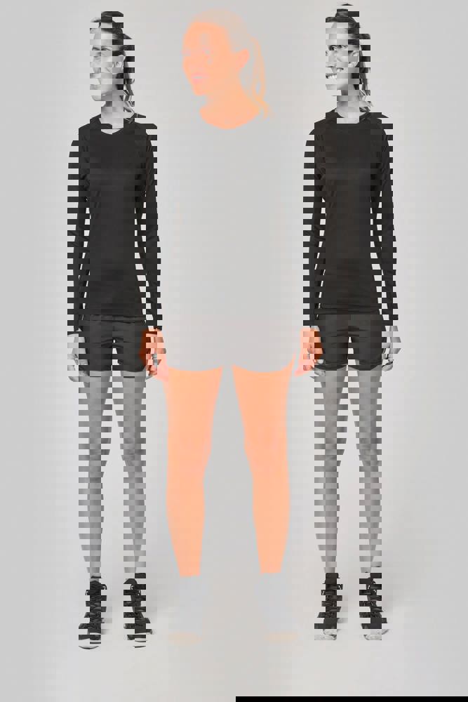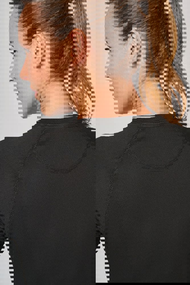 100% polyester. Sneldrogende lichte stof. Ronde hals. Nektape. Afwerking met dubbele stiksels aan de mouwuiteinden en onderkant.