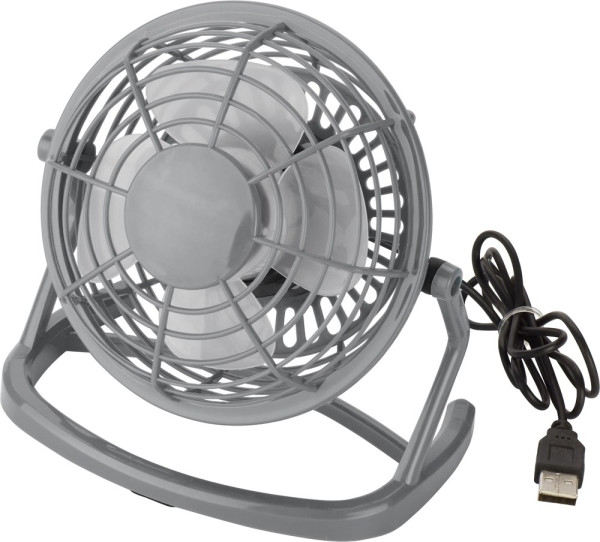 Kunststof bureauventilator met USB kabel (ca. 93 cm). Op de achterzijde bevindt zich een aan/uit knop.