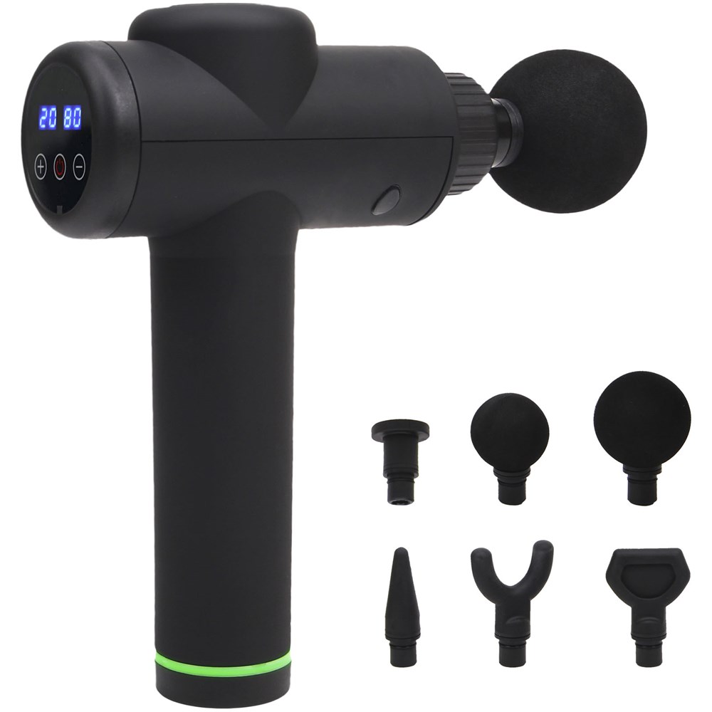 Draadloos massagepistool dat zowel voor fitness als voor fysiotherapie kan worden gebruikt. Het helpt om op te warmen voor het sporten, te herstellen van trainingen met lage intensiteit, pijn te verzachten na trainingen met hoge intensiteit en blessures te voorkomen. Inclusief 6 koppen om verschillende massages op verschillende delen van het lichaam uit te voeren. Bovendien heeft het 30 verschillende snelheidsinstellingen om aan alle behoeften te voldoen. Motorvermogen: 45 W (hoge prestaties). Weerstand: 3000 rpm. Lcd-scherm. Batterij van 2 x 2000 mAh / 12 V. Oplaadtijd 4-5 uur. Werkingstijd van 5-6 uur. Geluidsniveau < 65 dB.